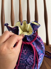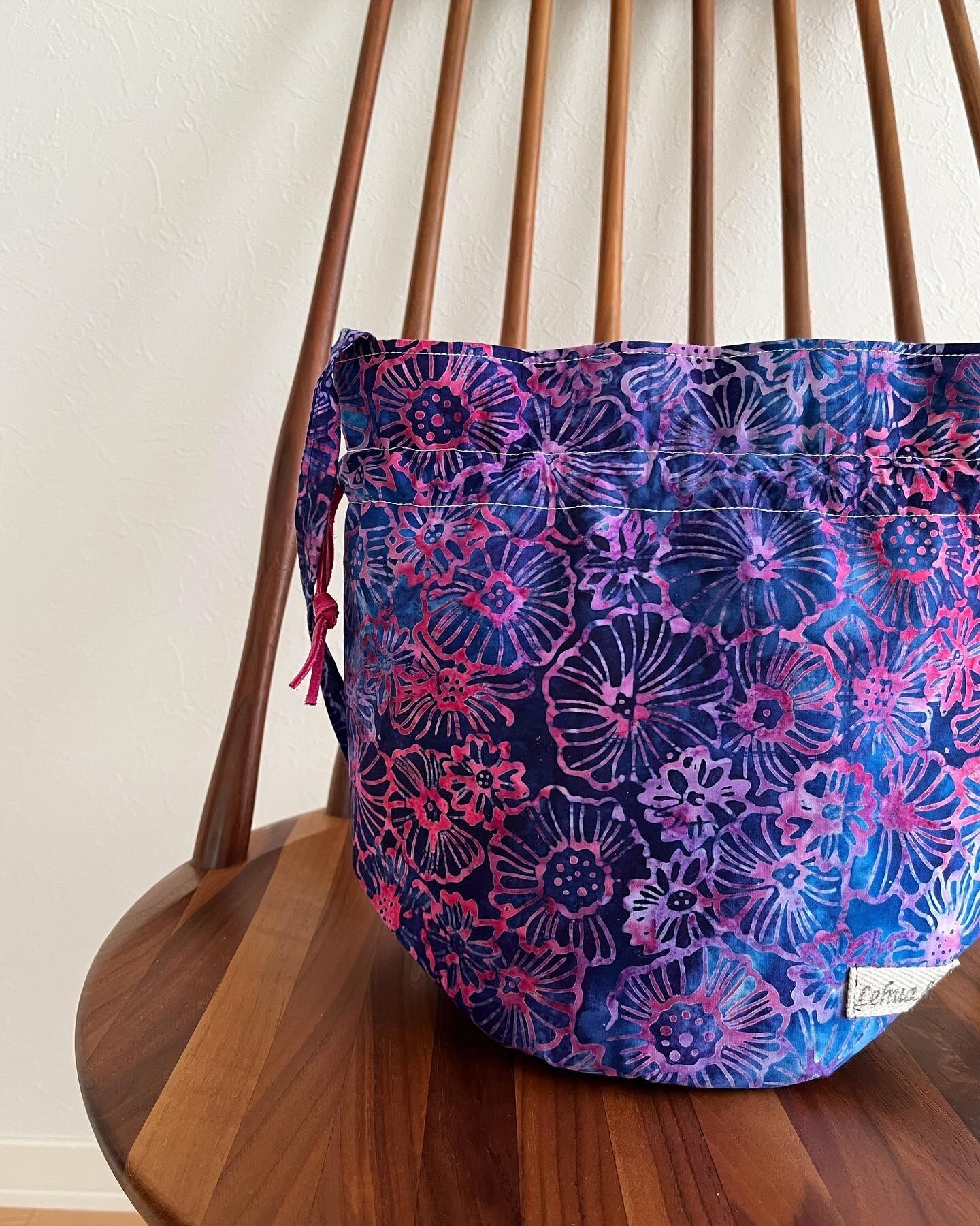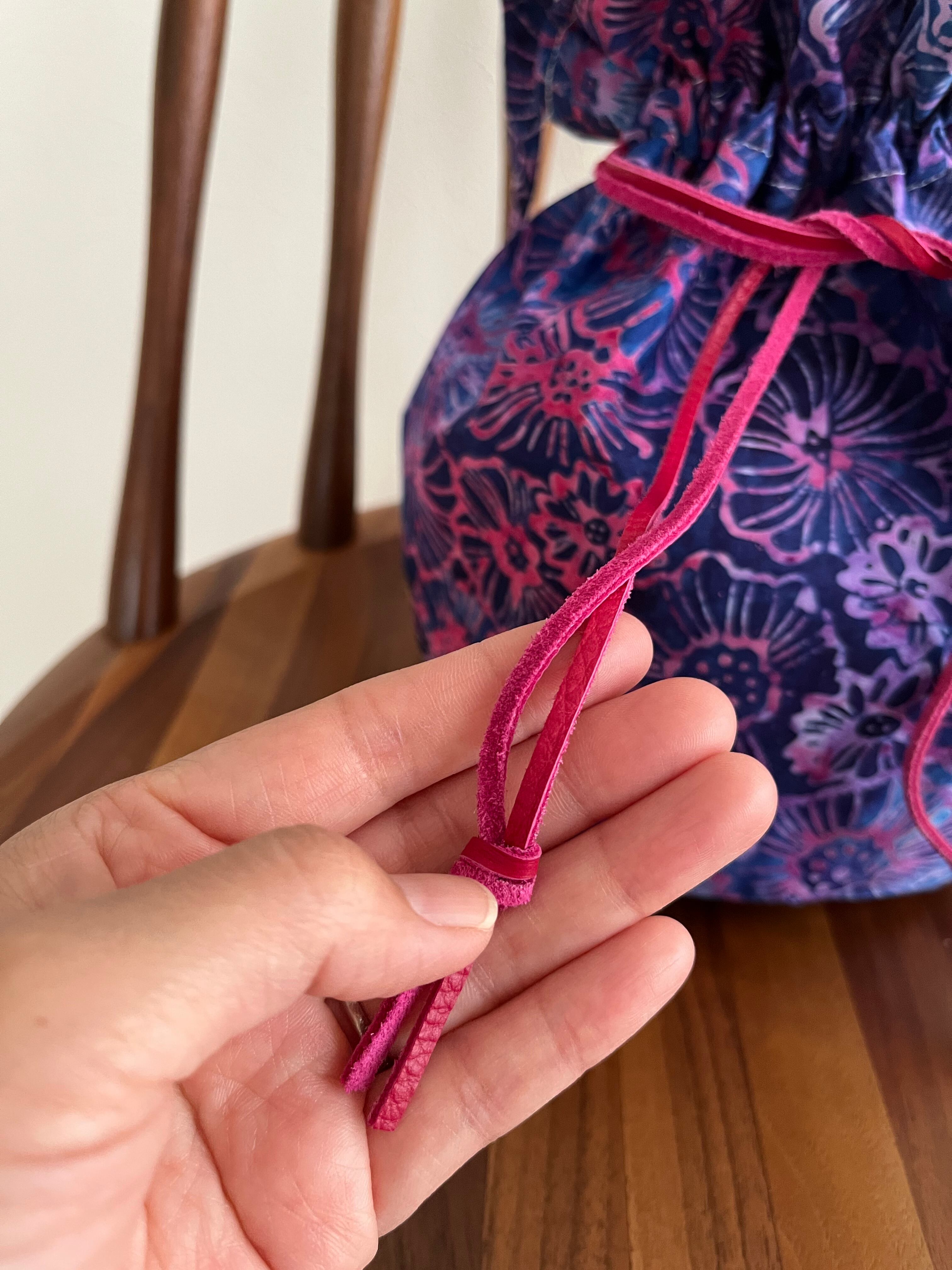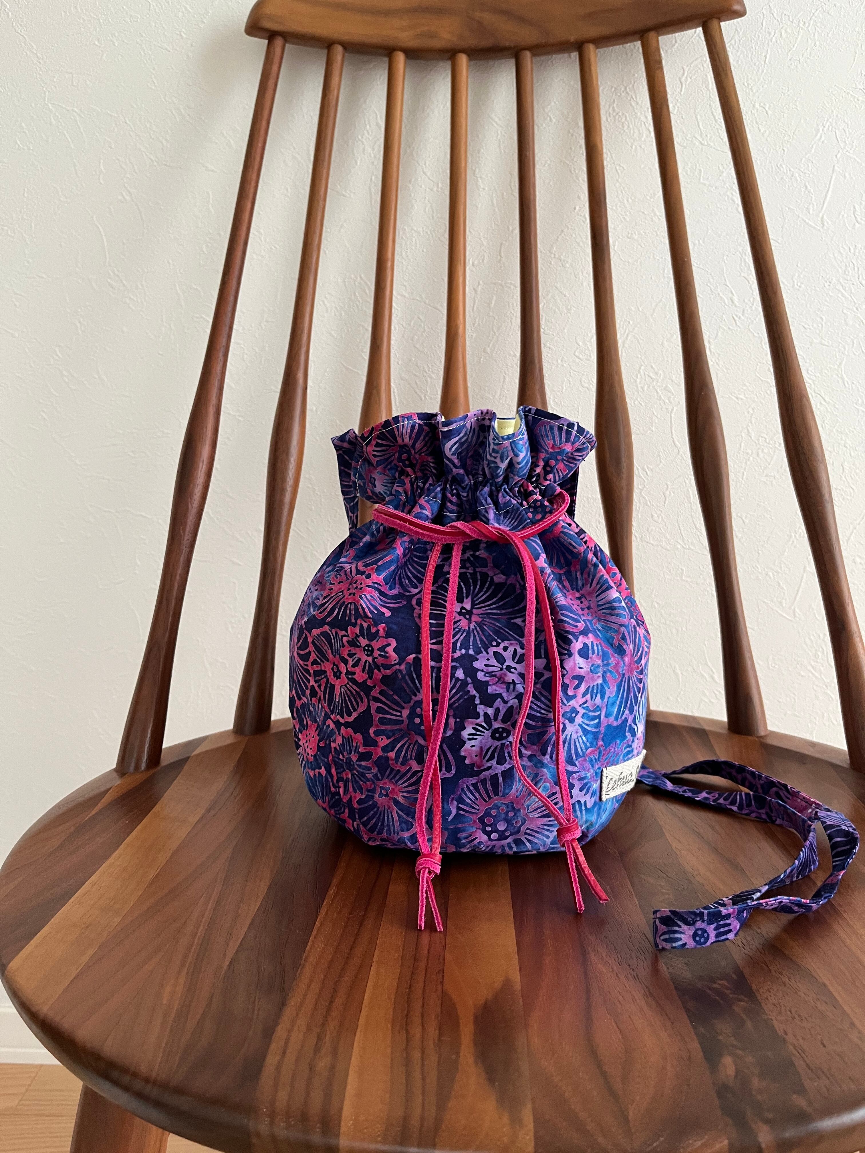 ショルダー紐は長めに作ってあるので斜めにもかけられますし肩にかける時は結んで使っても可愛いです。