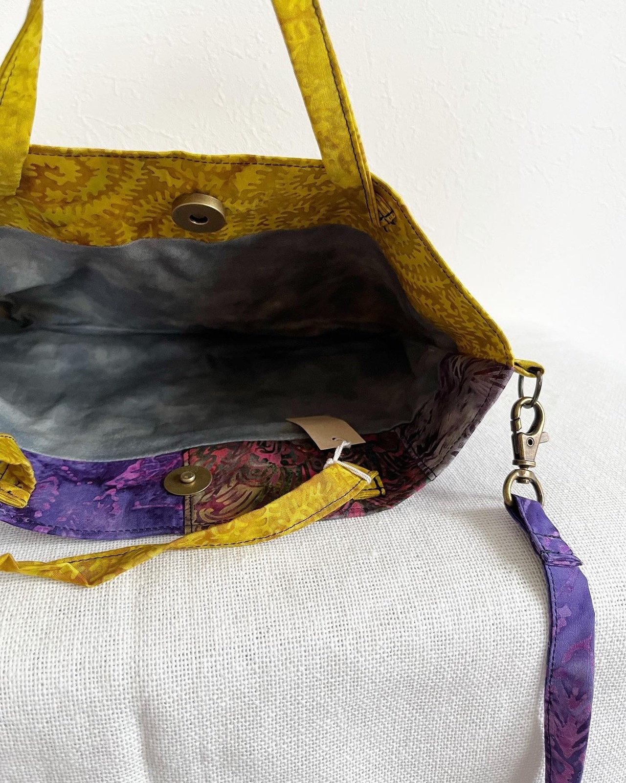 ショルダー紐は長めに作ってあるので斜めにもかけられますし肩にかける時は結んで使ってもok!